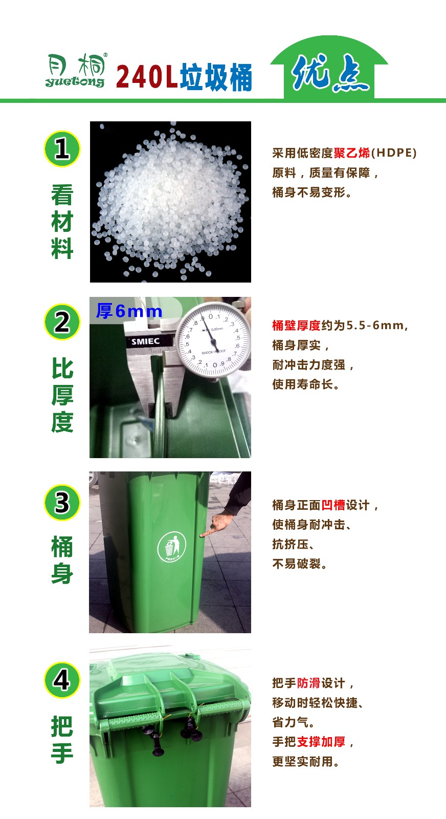 240升塑料垃圾桶采用環保材料特別加厚注塑而成,桶身表面光滑,方便環保人員清理。底部裝有靜音輪子,方便運輸,使用壽命長,可配合和垃圾車使用。適用于:物業小氣、廚房、街邊等。青島鑫金邦垃圾桶質量無憂、信譽有保障,歡迎來電咨詢!